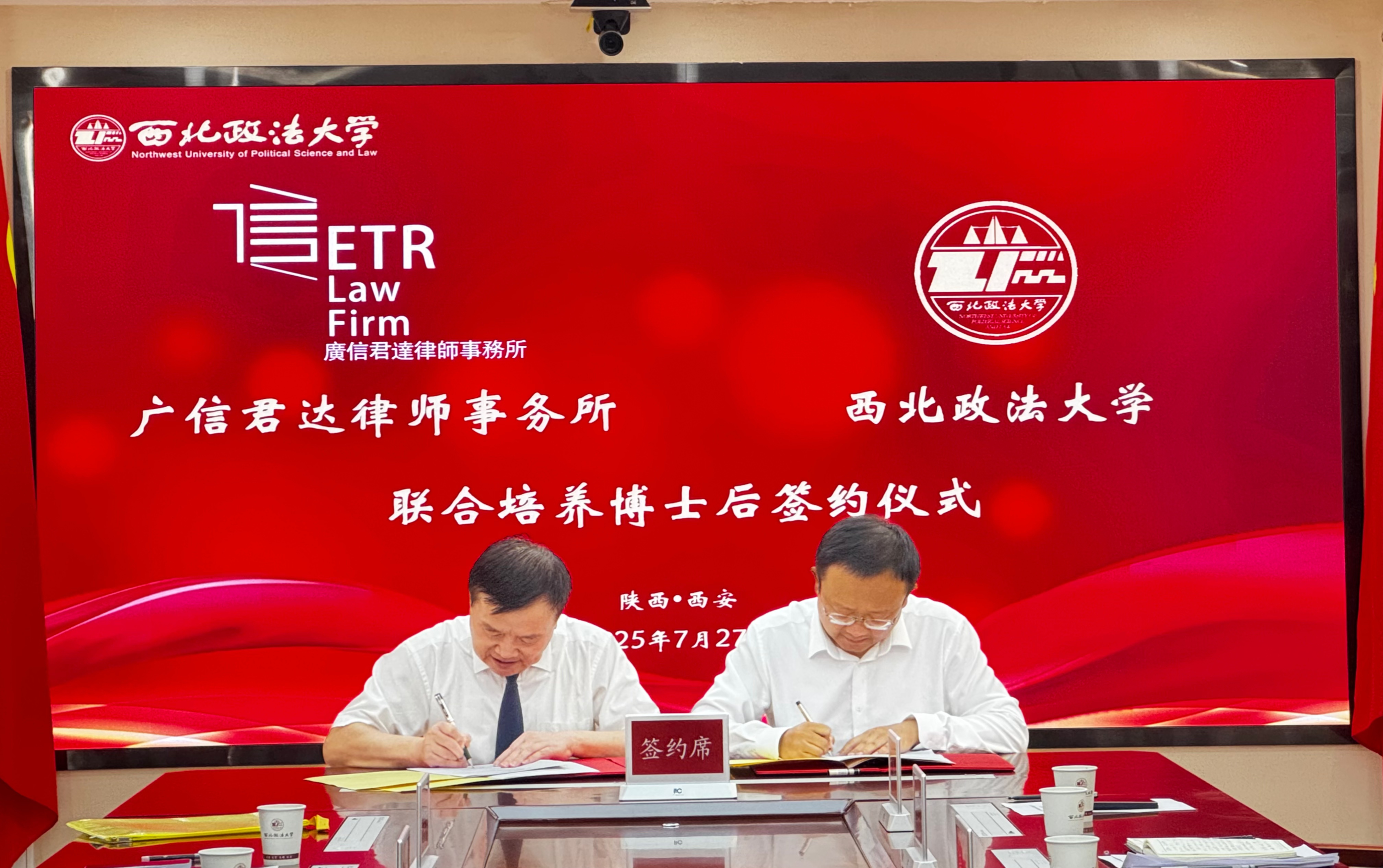 7月27日下午,我校与广东广信君达律师事务所联合培养博士后签约仪式在长安校区举行。副校长马朝琦,广东广信君达律师事务所战略委副主任、博士后创新实践基地学术委员会主任慕亚平,国家级涉外法治研究培育基地执行主任王瀚出席。党委教师工作部部长、人事处处长董玮主持签约仪式。