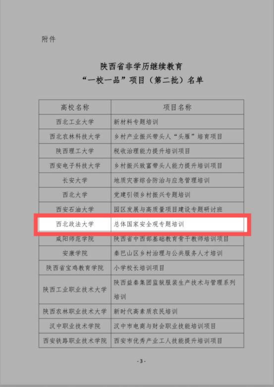 近日,陕西省高等继续教育学会公布了第二批非学历继续教育“一校一品”项目评选结果,我校“总体国家安全观专题培训”项目成功入选。这是继首批“社会治理专题培训”项目获评后,我校再次获评示范项目,充分彰显了学校在非学历继续教育领域的创新能力和品牌影响力。